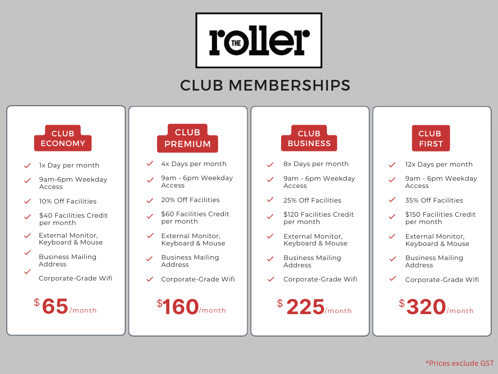 $40 credit each month for The Roller facilities including the Meeting Room, Photography Studio and The Podcast Studio.
